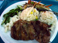 | さすがにお腹が空いてきたので今日の夕食を買うことにし、タモン中心地で唯一のフードコート(ザ・プラザ内)へ。 ここは麺類・和食・韓国・中華・ピザなどのお店が6〜7店舗あり、縦長で奥のスペースが飲酒・喫煙OKです。 主人は中華を、私は韓国料理のお店でユッケジャンをテイクアウト。 通常フードコートではライスか麺のどちらかを選ぶのですが、この中華屋さんは両方をワンスクープずつ選べます。 ちょっとした違いですがいろんなものをちょっとずつ食べるのが好きな私はこちらの方が好き。 |