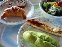 | どのパンもそれぞれおいしかった。 アーモンドがのった細長いパンはちょっと甘いけれど、 これから街歩きをする私のエネルギーになりました。 |