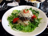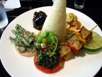 | ゆっくり見学したので気が付くと1時を過ぎていました。さすがにお腹の虫も騒ぎ出したので、昼食を食べるこ とに。昼食は旧居留地にある「ロイスカフェ」までタクシーで向かいました。 バリの別荘をイメージしている店内は、水の流れが心地良く、モダンなのになつかしい雰囲気。私はお勧め の「バイキングランチ」を注文。とがったご飯を崩して、周りの5種類のおかずと混ぜてビビンバのように食べ ます。おかずは、バジル風味のチキン・茄子のテンメンジャン炒め・エビのココナッツ風味など。 最初は全部混ぜたら訳の分からない味になるんじゃないのかなと思いましたが、混ぜてみると本当においし かった。全体的に濃い味なのですが、最後にライムを絞ったので爽やかさもプラスされました。アジアご飯が 大好きな私達にはピッタリのお昼ご飯です。 このお店はドリンクやデザートも人気なのだそうです(私には無縁。。) 雰囲気は素敵だし店員さんも気持ちが良いし、落ち着けるカフェです。周りは若い女性ばかりでしたが(笑) 実はジーニアスカフェと迷ったのですが、雨模様だったのでオープンテラスのジーニアスカフェは諦めてこち らのお店にしたのです。ジーニアス風ジャポネライスも食べたかったな〜 次回は行くぞ。 参考にした旧居留地のオフィシャルサイトはこちらです。 |