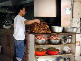 今日の朝食は涼麺。「旅々台北」というサイトで見て、絶品の胡麻ダレをとっても楽しみにしていました。場所はMRT忠孝敦化駅から5分程なのにホテルからタクシーでびゅ〜んと向かう。タクシーに乗って40元の涼麺を食べに行くのも、う〜ん、地元の人から見ると一種の矛盾が存在するかも?と思いながら駅を背にあるはずの屋台(風の店)を探して歩く。が、ない。一度引き返して再び目を凝らすもやっぱりない。。もしかして今日お休み?でも旅々台北の紹介ページでは第2、4日曜お休みってなっているけど今日は第3日曜。営業しているはずなんだけど、どうしても見つからない。仕方が無いのでさっさと諦め、他の朝食処へ移動することにする。時間は9時半を過ぎたところ。この時間で食事が出来て食べたい物は、と、リストから「排骨大王」をチョイス。ここは今回は是非再訪したいお店のひとつです。 |